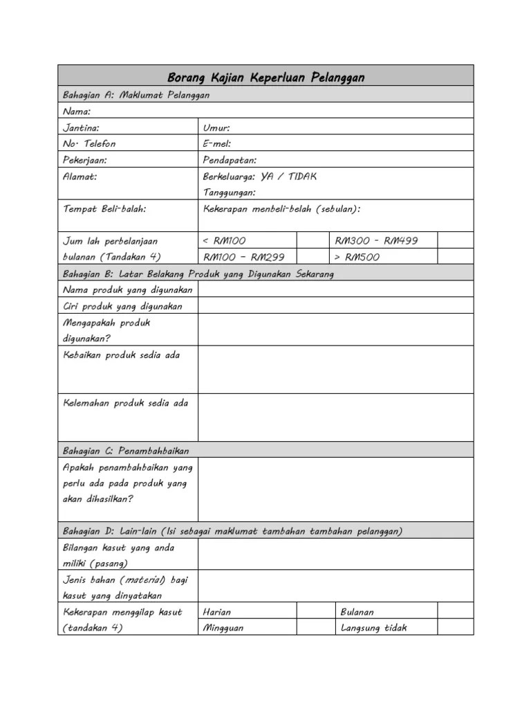 View borang kajian keperluan pelanggan.pdf from spm 2018 at universiti putra malaysia. Apakah 2 kriteria yang perlu ada dalam borang kajian keperluan pelanggan? Pastikan penyelesaian masalah inventif anda tentang penghasilan produk baharu anda . Baca versi flipbook dari borang kajian keperluan pelanggan.